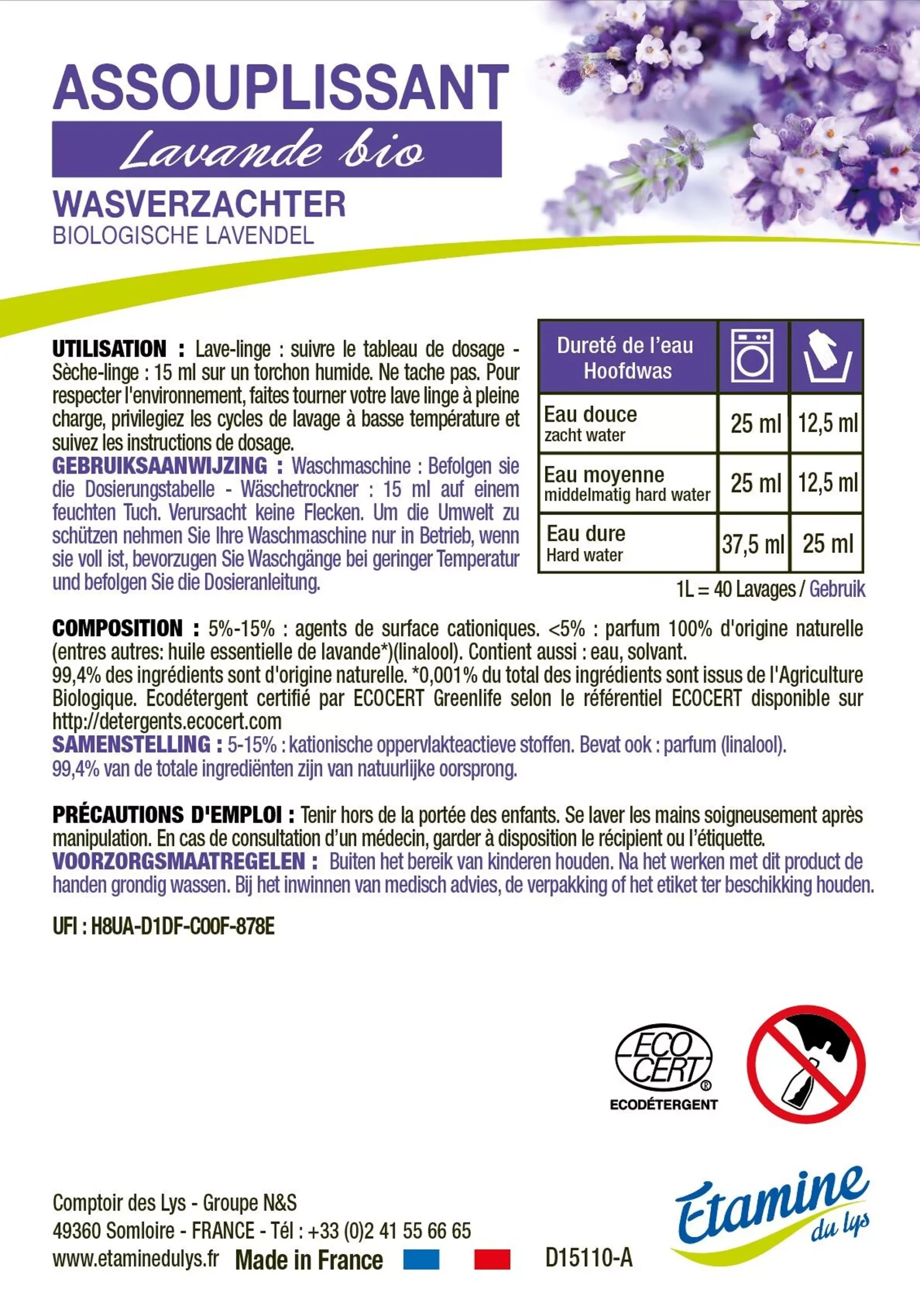 Cet assouplissant, parfumé à l’huile essentielle de lavandin bio, est un choix idéal pour donner souplesse et douceur à votre linge. Il empêche la formation d’électricité statique, ce qui rend vos vêtements plus confortables à porter et plus faciles à entretenir. En protégeant les fibres des tissus, il contribue à prolonger la durée de vie de vos vêtements, les préservant des désagréments liés à l’usure. Optez pour cet assouplissant pour un linge toujours impeccable et agréablement parfumé à la lavande, transformant votre routine de lavage en une véritable expérience sensorielle.