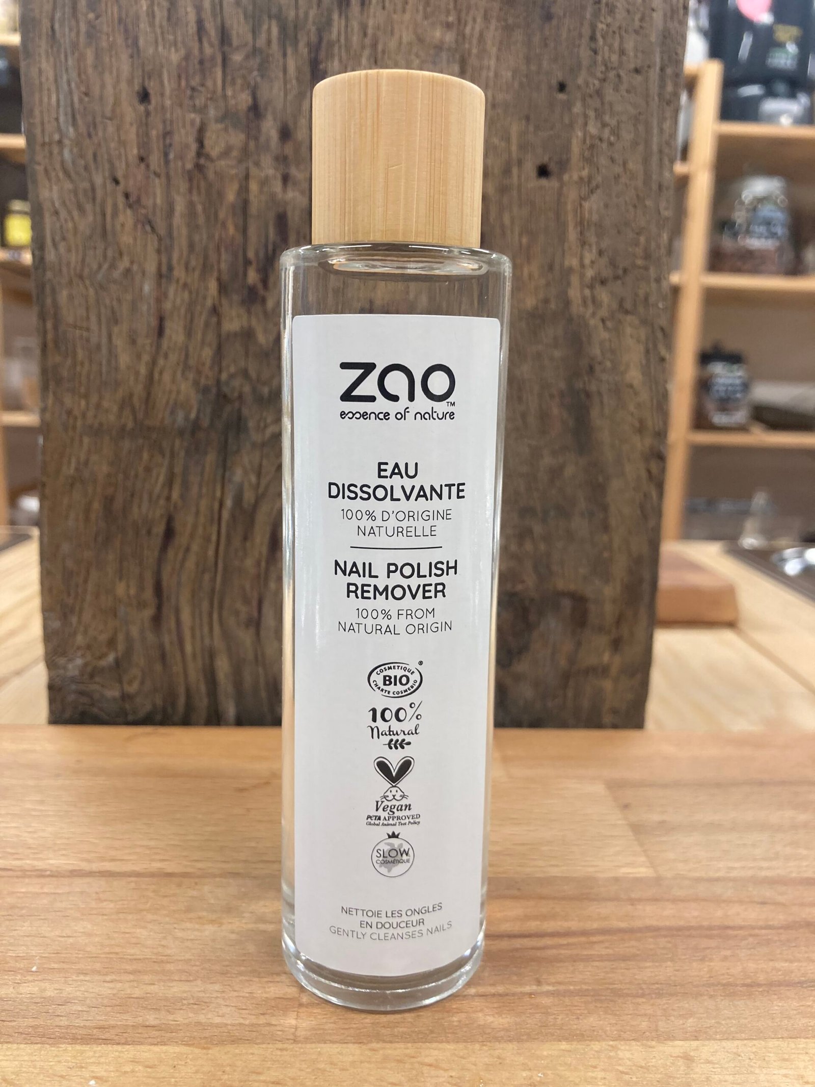 L’eau dissolvante Zao est formulée sans acétone et sans acétate d’éthyle. Sa formule 100% d‘origine naturelle, vegan et validée Bio cosmos par Ecocert, élimine en douceur le vernis à ongles sans dessécher la peau, ni agresser les ongles.