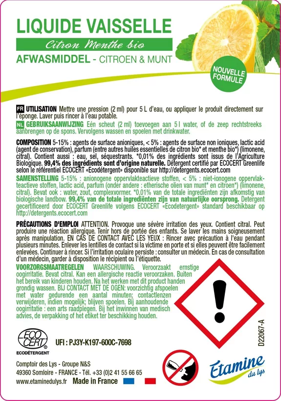 Un liquide vaisselle doux pour vos mains, redoutable pour la vaisselle ! Composé d’ingrédients d’origine naturelle, il nettoie efficacement et fait briller votre vaisselle tout en prenant soin de vos mains. Ultra-dégraissant, il élimine les résidus alimentaires et fait briller la vaisselle.