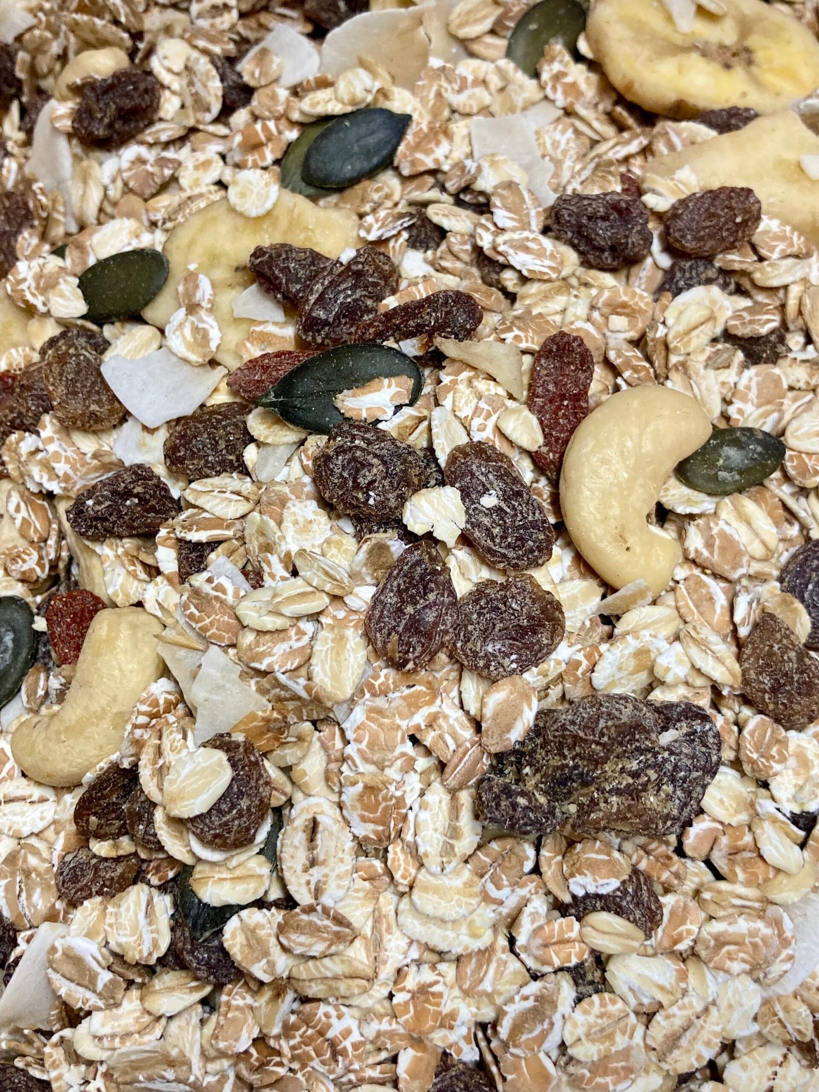Raisins secs (raisins, huile de tournesol), flocons d'avoine complets 15%, flocons de blé complets 14%, flocons d'orge complets 14%, flocons de seigle complets 14%, chips de bananes (bananes 6,1%, huile de noix de coco, sucre de canne), noix de cajou 3,5%, noix de coco toastée 3%, graines de courge 3%, baies de goji séchées 2,5%.