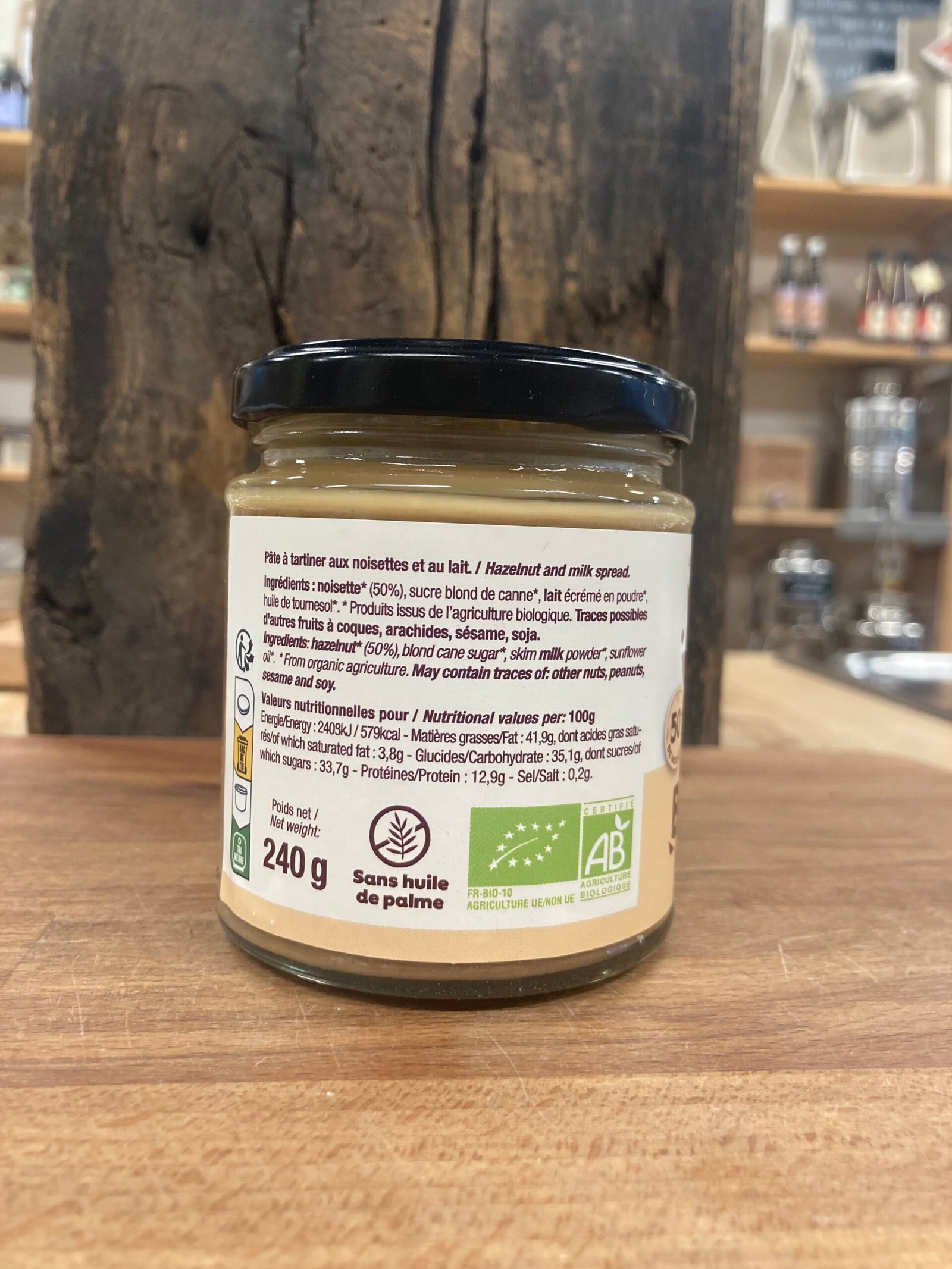 NOISETTES* (50%), sucre de canne*, LAIT écrémé en poudre*, huile de tournesol*. *Produits issus de l'Agriculture Biologique