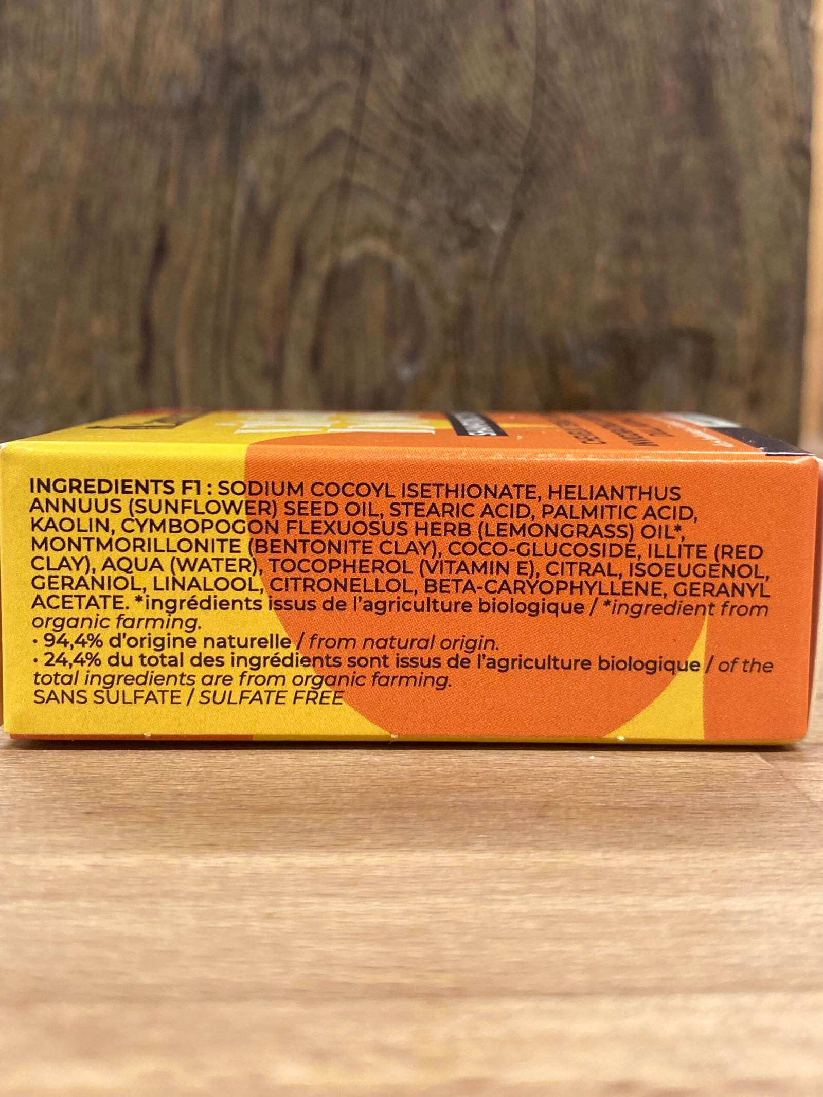 SODIUM COCOYL ISETHIONATE, HELIANTHUS ANNUUS SEED OIL*, STEARIC ACID**, PALMITIC ACID**, KAOLIN**, CYMBOPOGON FLEXUOSUS OIL*, MONTMORILLONITE**, COCO-GLUCOSIDE**, ILLITE**, AQUA**, TOCOPHEROL**, CITRAL, LIMONENE, GERANIOL, ISOEUGENOL, LINALOOL.